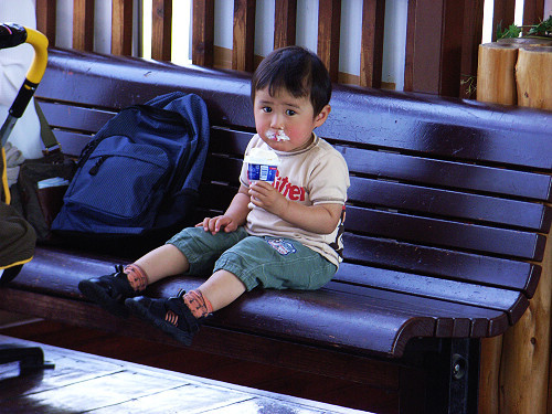 等小火車的時候,看到一個日本小弟弟,手裡握著的是北海道的牛奶冰筒,吃的滿嘴都是,當然後來我們也買來吃了...天氣很熱